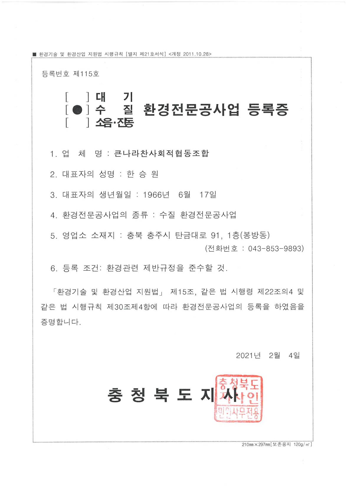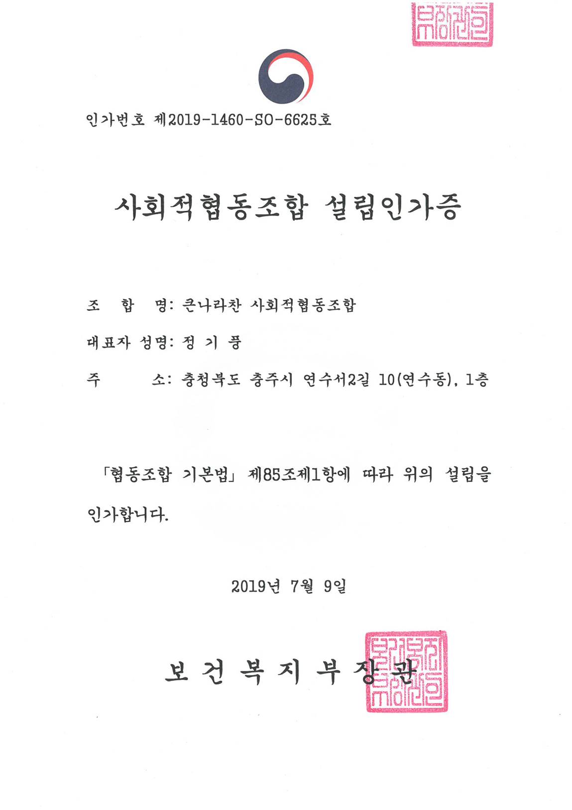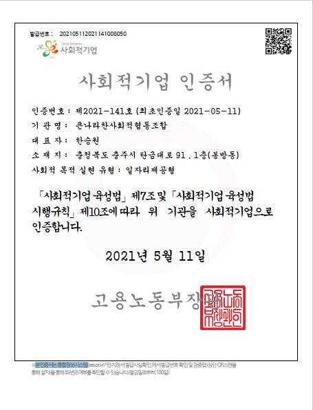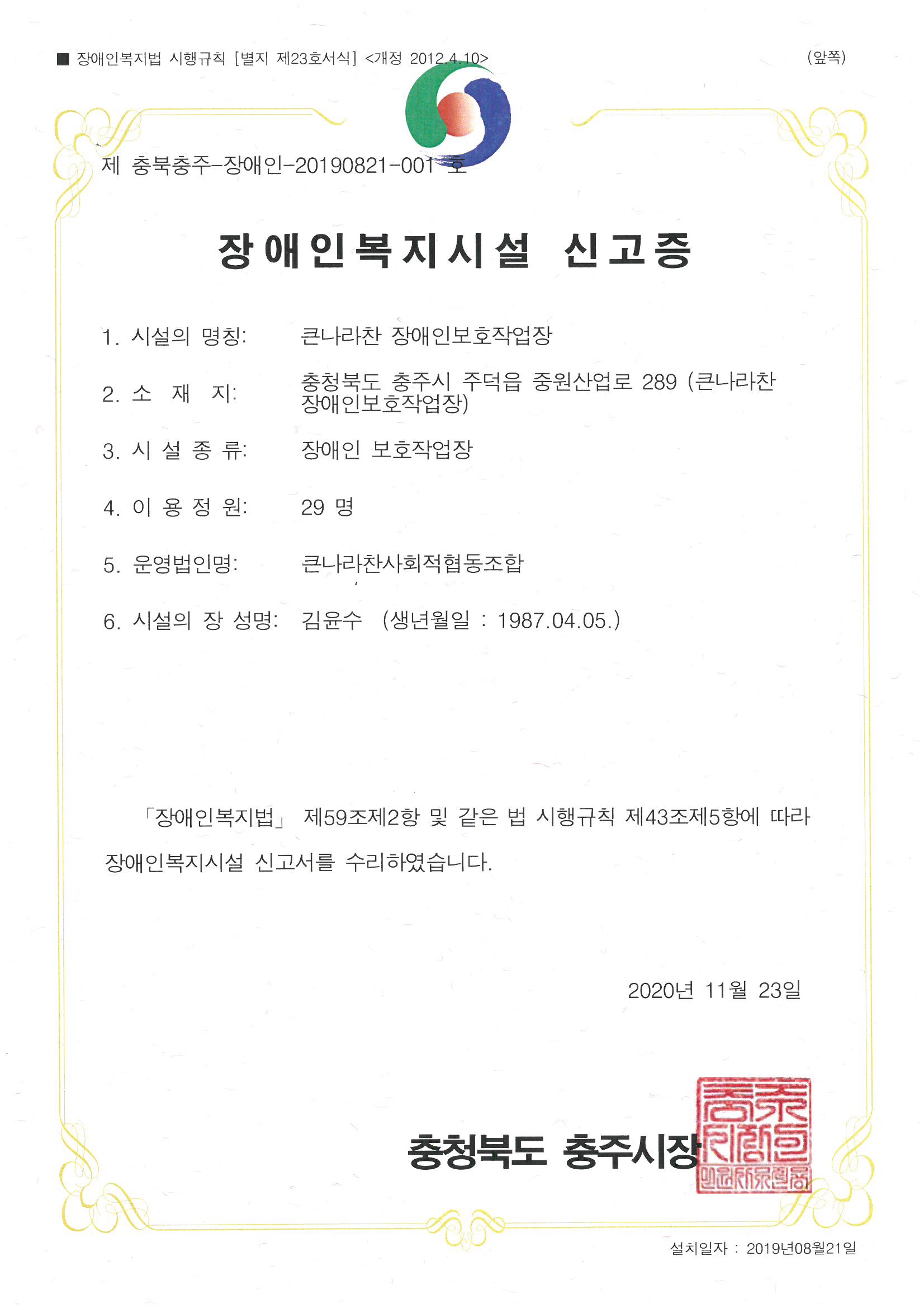 큰나라찬은 보건복지부로부터 인가받은 사회적 협동조합으로 장애인 보호작업장을 운영하며 인간의 가치를 최우선으로 하고 사회적 약자와 동반 성장을 목표로 하는 법인입니다.